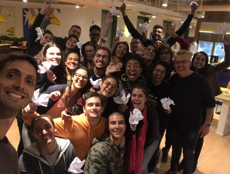 No dia 17 de agosto, a tão esperada integração ocorreu! Os participantes se reuniram no espaço WeWork em São Paulo e, como quebra-gelo, precisaram construir uma torre com o que tivessem disponível no momento. A torre então foi composta pelos tênis dos participantes.